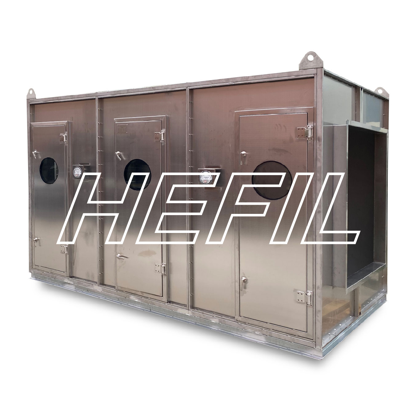圖例:BAFH-15000-3型高效過濾箱(初、中、高效三級過濾)。不銹鋼箱體材質。